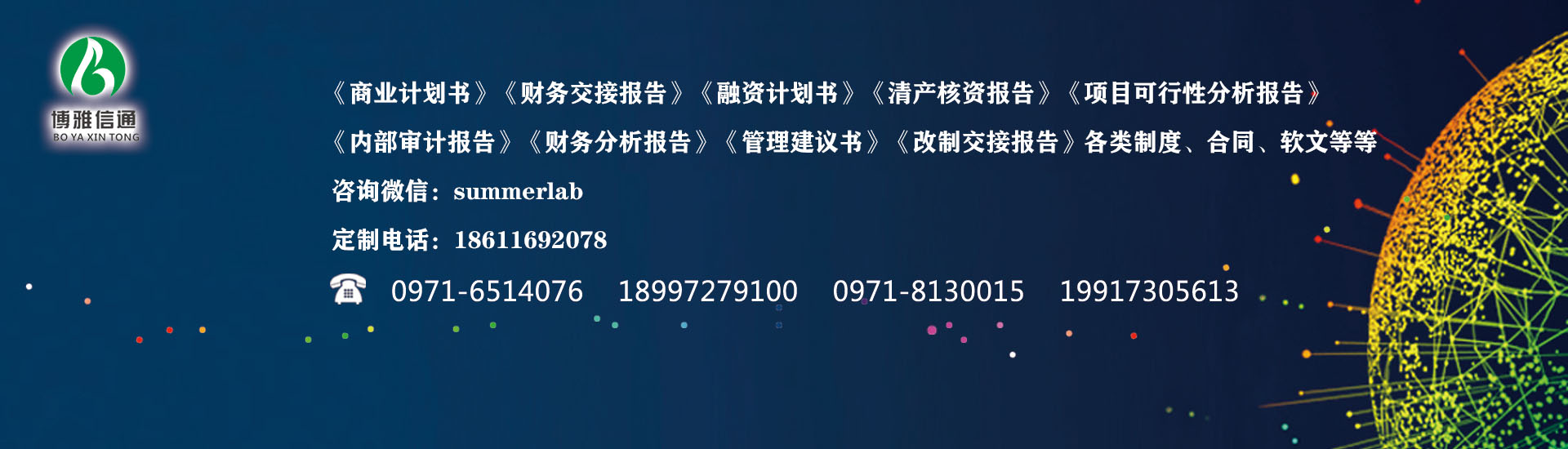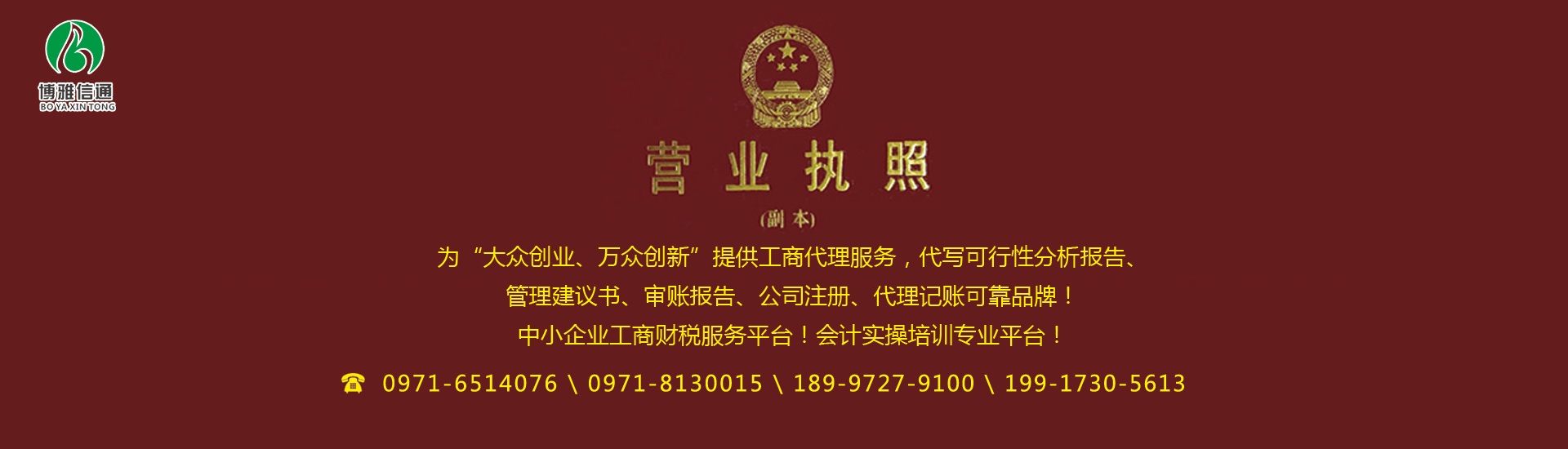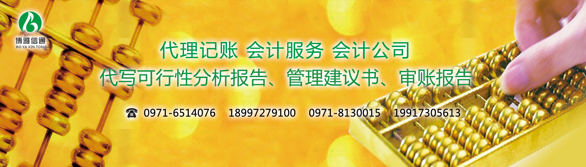 北京博雅信通會(huì)計(jì)服務(wù)有限公司西寧分公司為各中小企業(yè)提供各種專業(yè)工商財(cái)稅會(huì)計(jì)服務(wù)。包括公司設(shè)立籌劃、公司注冊、執(zhí)照變更、代辦注銷、代理記賬報(bào)稅、亂賬整理、會(huì)計(jì)實(shí)操培訓(xùn)、會(huì)計(jì)職稱培訓(xùn)(會(huì)計(jì)取證培訓(xùn))等一站式服務(wù)體系,誠信、專業(yè)、高效、省心! 公司簡介: 北京博雅信通會(huì)計(jì)服務(wù)有限公司西寧分公司 成立于2003年,積累了幾十個(gè)行業(yè)工商財(cái)稅會(huì)計(jì)服務(wù)經(jīng)驗(yàn),主要提供公司注冊、執(zhí)照變更、企業(yè)注銷、工商年報(bào)、代理記賬、納稅申報(bào)、會(huì)計(jì)培訓(xùn)、財(cái)稅顧問等一系列服務(wù)。全程工商財(cái)稅老板們甩手我們代理,并且用足用好工商財(cái)稅優(yōu)惠政策,讓企業(yè)老板省心、省時(shí)、省事兒!節(jié)約會(huì)計(jì)核算和納稅成本,解放您的寶貴時(shí)間抓好企業(yè)經(jīng)營,做您的...